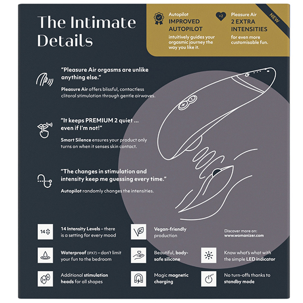 従来までのウーマナイザーと比べ、新機能を搭載したワンランク上の「ウーマナイザー プレミアム2 (ブラック)」が登場しました。吸引部分にはタッチセンサーが搭載され、ボタンを押さなくてもお肌に当てるだけで吸引♪離すだけで振動が停止。これまでのようにボタン操作の煩わしさがなくなり、より快適に楽しめるようになりました!さらに新機能のパイロットコントロールによりボタン操作をしなくても吸引の強弱を自動でコントロール。弱・中・強の3段階のレベルからセレクトでき、毎回予測できないユニークな振動が味わえます!従来品と比べて吸引振動強弱は14段階に、パイロットモード搭載(強弱3段階)、素材はシリコン/ABS樹脂で2時間のフル充電で連続4時間の使用が可能です。※製造時期によりパッケージが異なる場合がございます。※こちらの商品は受注発注商品の為、ご注文から発送までに3、4営業日掛かる場合が御座います。 |