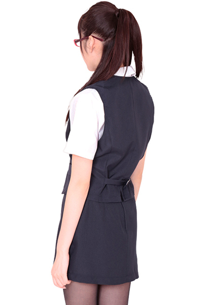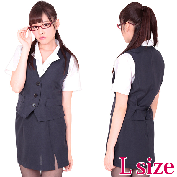 紺と白の定番オフィスレディ風セクシーコスチューム(L)。落ち着いた紺色が清楚な秘書の雰囲気を演出!セクシーな胸元の半袖ブラウスとミニスカートに、3つボタンベストのなりきりコスプレ3点セットで、魅力的なOLに変身しちゃおう!※LLサイズ(b17521)あります。※メガネは付属しません