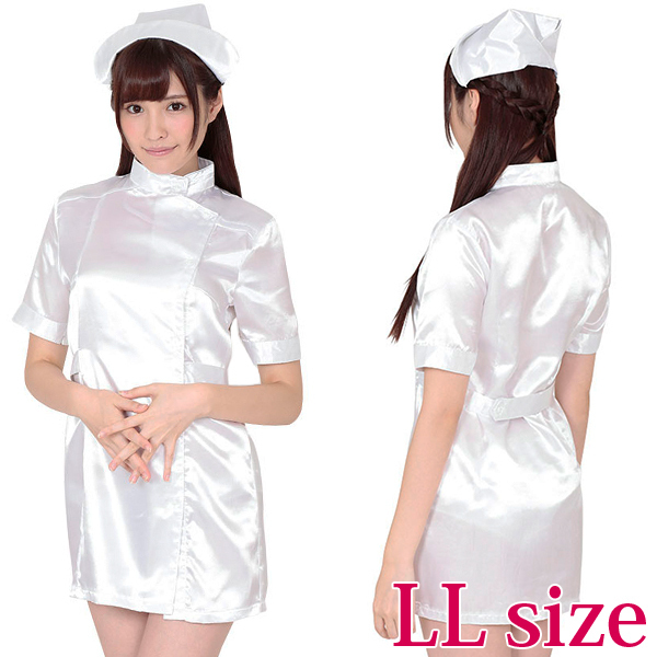 男女問わず、誰もが一度は憧れるナース服コスチューム(LL)。キラキラとした純白生地の光沢感がとってもキレイ!セクシーなミニスカートのワンピースと、ナースキャップのコスプレセットです。フロントはボタン式で下まで開きます。※Mサイズ(b15245)、Lサイズ(b18109)あります。