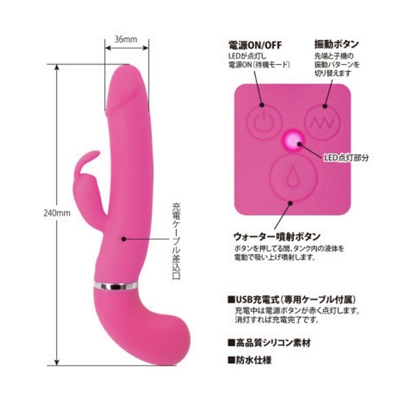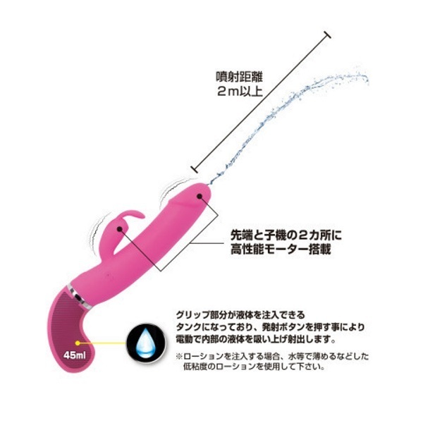 遂に登場!中出し体験ができる疑似射精機能を搭載した高性能バイブ「ウォーターガンバイブレーター」。●ピストルのようなシルエット●高品質なシリコン素材を採用●滑らかボディで挿入感も抜群●先端&子機に高性能モーター●12種類の多彩な振動パターン●ウォータースプレー機能搭載●液体45mlをタンクに注入可能●ボタンを押すと先端から噴射●液体の噴射距離は約2m以上●生活防水仕様で丸洗い可能●電源はUSB充電式。先端からお好みの液体をドピュッと発射!中出し体験が出来るウォータースプレー機能を搭載した「プリティラブ」シリーズのバイブレーター。雫マークの噴射ボタン押下中は、タンク内(グリップ部)にある液体を自動で吸い上げて噴射し続けます。※詰まり等の原因になりますのでローションをタンクに注入する場合は、水やぬるま湯で薄めた低粘度のローションをご使用ください。 |