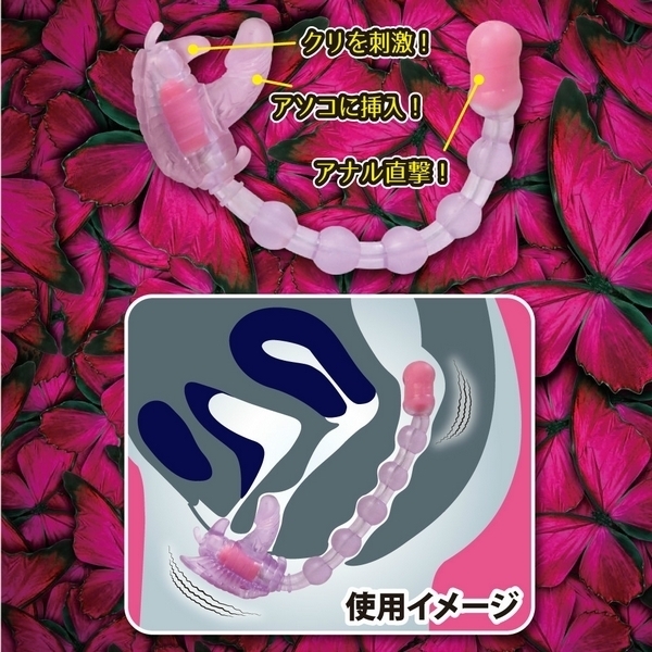 ガッシリ固定で3点同時責め!ベルト固定式のバタフライ型ローター「バタフライエフェクト」。●挿入したままベルトで固定可能●裏側の小突起でクリトリス責め●ペニス型の突起でヴァギナ責め●20cmのロングビーズでアナル責め●柔らかで丈夫なエラストマー素材●ヴァギナとアナル側に強力モーター●7種類の振動パターンを搭載。前も後ろも強力悶絶刺激!奥深くまで響く快感振動のベルト装着型ローター。バタフライのディルド部とアナルビーズ先端にダブルモーターを搭載!ゴム製ベルトでしっかりと固定できるので、装着したまま外出すれば屋外プレイもお楽しみ頂けます。 |