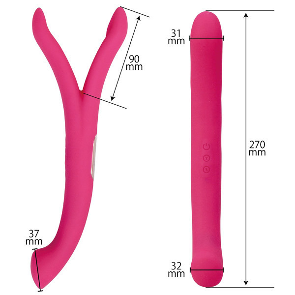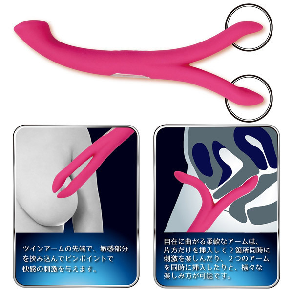 3分間以内のアクメ率なんと92%の瞬間絶頂!挟み込み&挿入どちらも楽しめるツインアームの双頭バイブ「シークレットガーデン トライ」。シリコン製のボディそれぞれの先端3ヶ所に、8パターン振動を備えた高性能モーターを搭載。二股のアームで乳首やクリをピンポイントで挟み込み!また、J型に絶妙なカーブを描く逆側のテールバイブはGスポットを確実に捉え、芯まで響くアクメ必至の強力刺激をもたらします。自在に曲がる柔軟なアームは片方だけを挿入して二ヶ所同時刺激や、二つのアームを同時に挿入したりとマルチに楽しめます。USB充電式(専用コード付属)。 |