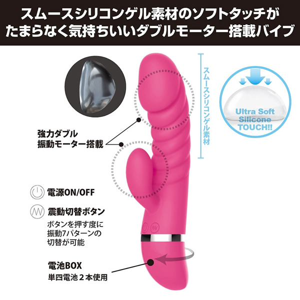 今までにないような最高の弾力感が、貴方の中で深く振動する高性能のバイブレーター。先端からちょうど真ん中までがグミのような人肌に近い素材のシリコンゲルを使用しており、挿入した瞬間からその柔らかく心地よい弾力感が通常のバイブとは異なった挿入体験をさせてくれます♪胴体は波打つようなウェーブデザインで、出し入れするたび膣壁を擦りあげ、さらに先端と子機に内蔵された強力なモーターが7パターンの振動で外・内を同時に刺激。面倒な操作は要らず、1つのボタンをポチポチっと押すだけでパターン変更できるから、好みの振動で目一杯お楽しみいただけます♪また、生活防水機能を搭載しているのでお手入れも楽々。扱いやすく大激震!ただのシリコン製バイブじゃない、実物ペニスのような肉感をぜひ体験してみてください♪ |