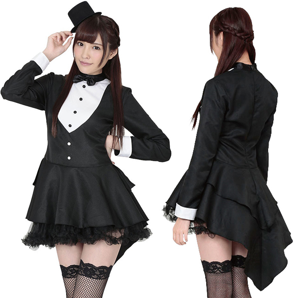 タキシードと言えば正装のきっちりとしたイメージが強いですよね。しかしそんなイメージを払拭!フリルと黒のチュールレースでボリュームを持たせて可愛くガーリーに仕上げました♪また、数あるタキシードのタイプから格式の高いテールコート(燕尾服)をチョイス!燕尾にフリル感をプラスすることで女性人気の高いフィッシュテール風にデザインしています。セットのミニハットを被れば一層可愛さUP!ステッキが有ればなお気分が高まります♪※こちらの商品は受注発注商品の為、ご注文から発送までに3、4営業日掛かる場合が御座います。 |