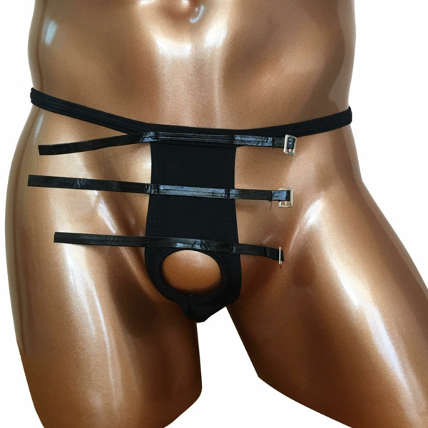 タマ部分を露出する大胆さが魅力の拘束具付きメンズ用Tバック(黒)。露出度高めの奇抜なデザインが視覚を刺激する一枚!洗濯する際は優しく手洗い、または網ネットに入れて洗濯して下さい。