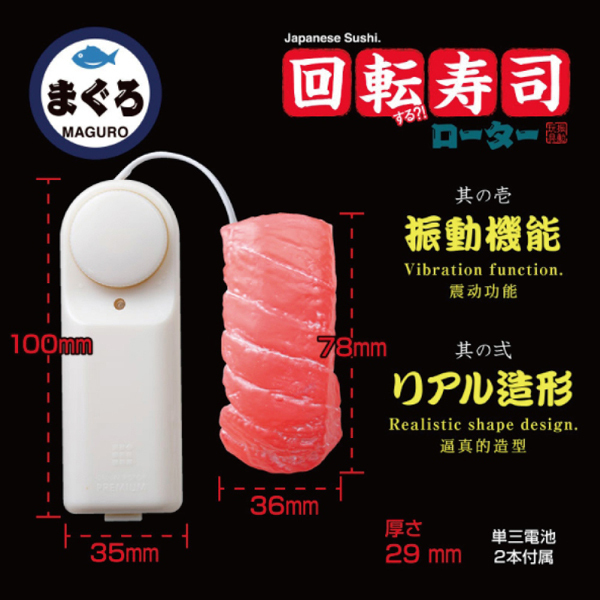 うっかり食べてしまいそうなくらいに精巧!寿司ネタの王様「マグロ」を完全再現した振動機能付のユニークな電池式ローター。一見グッズに見えないマグロデザインは、外国人のお客様も思わず「OH!Fantastic!」と言ってしまうほどのクオリティ♪日本を代表する和食料理「寿司」を模したローターは、これまでにないユニークな逸品に仕上がっています。単三電池を2本使用