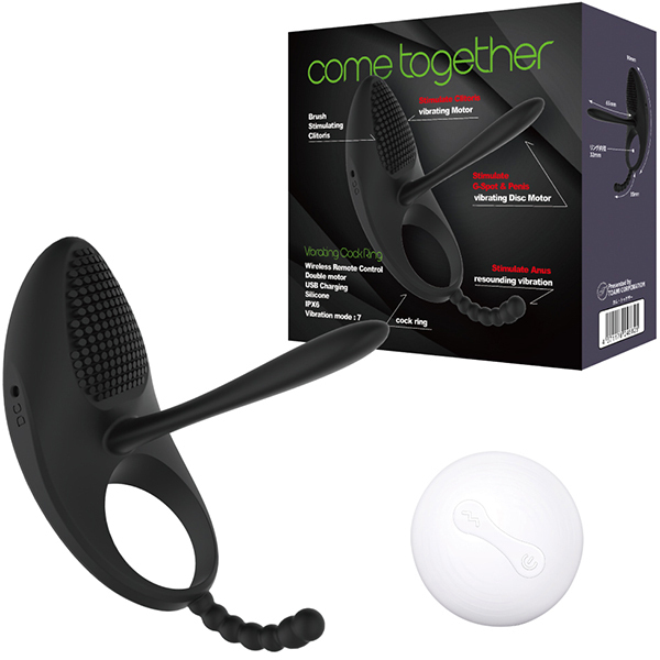 女性を喜ばせるコックリングが超絶進化した!クリへの振動も楽しめる電動コックリング「カム・トゥゲザー」。電源はUSB充電式でリモコン操作が可能♪簡単に装着できてクリへの振動はもちろん、ペニスと共に挿入するサブシャフトも振動するのでアナルへもアプローチできるというトリプルギミックを搭載!中も外も男性自身も振動を味わいながらプレーが楽しめて、男性自身を締め付けながら増強を促す効果も♪各種バイブレーションがリモコン操作できるので振動変化もお楽しみいただけます!7パターンの振動機能にUSB充電式でケーブル付属。シリコン素材でIPX6防水仕様と心強いスペックとなっております♪底部のフックしたアナルビーズのような短いシャフトはアナルに挿入することも可能です。 |