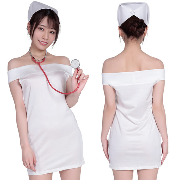 こんなナースになら是非看護してほしい♪プライベートでコスプレを楽しむときに着たくなるオフショルダーラップ風なワンピースデザインのナースコスチュームです。肩の部分の露出が多めでデコルテのラインを強調するデザインが素敵!ドレスをモチーフにしたオフショルナースで着心地も抜群です♪