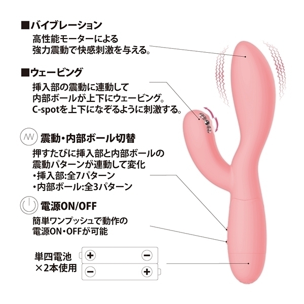 機の先端に内蔵された「上下にスライドするボール」により、指先でこねくり回すようにCスポットを刺激する快感バイブレーター!更に挿入部に内蔵された強力震動モーターが、Gスポットを同時に絶頂刺激!シリコン製の程よい柔らかさのボディで挿入感抜群です。●3パターンの子機先端ウェーブ●7パターンの強力振動●高品質シリコン素材●生活防水