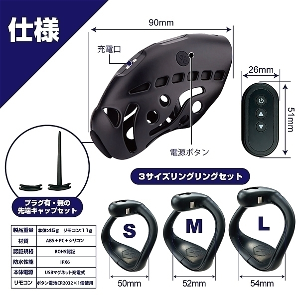 射精管理電流調教!悶絶!電撃低周波パルスコックケージの新商品が登場!熱や衝撃に強いABS樹脂で造形された、見た目もスタイリッシュな見た目。陰茎上部とリングの二か所から放出されるパルスは、9段階強さの調整が可能。初心者でも安心な弱パルスから、痛みを伴う強パルスまで、レベルに合わせて使用可能。自身のサイズに合わせやすい、3サイズのリング付き。