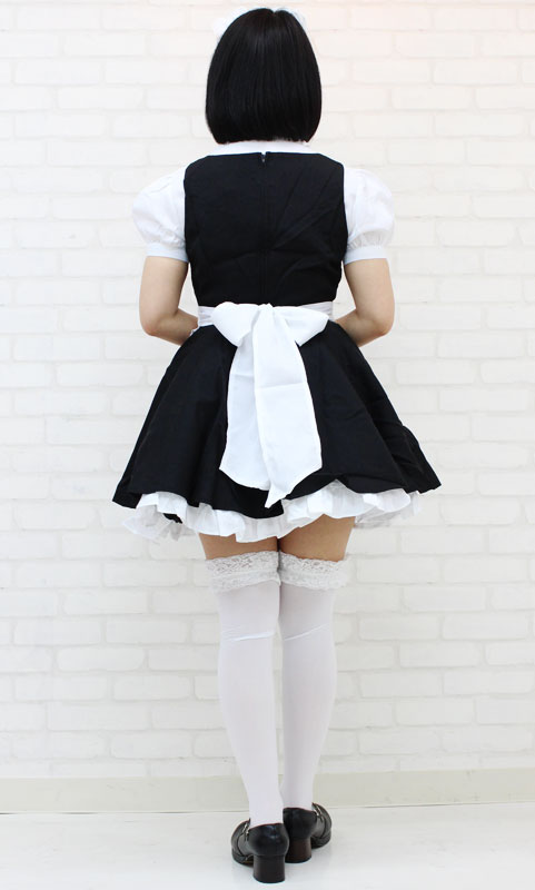 BIGサイズ:B〜104cm・W〜86cm 丈:ワンピース83cm(裾フリル含む)・ブラウス63cm(袖丈25cm、袖幅35cm、肩幅47cm、首周り43cm) セット内容:ブラウス、タイ(ナップボタンにて取り外し可能)、ワンピース(背中ファスナー)、エプロン、カチューシャ