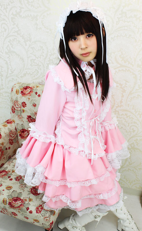 BIGサイズ:B〜100cm・W72〜120cm 丈:上着52cm(袖丈65cm・肩幅40cm)・スカート49cm 付け襟(首回り)43cm セット内容:上着(前ボタン)・スカート(ウエスト部分ゴム、スカート3枚仕立て、裏地付き、チュールパニエ付き)・付け衿(ボタンにて着脱可)・ヘッドドレス