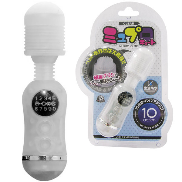 ノーマルヘッドを外すとブラシ型ヘッドが登場!二通りの使い方が出来る、コンパクトでキュートなミニ電マ(クリア)。スイッチを入れるとLEDバックライトが点灯し、ムードある光を放ちます。小さいボディに10種類ものバイブレーション機能を搭載。マットコーティング加工を施して、汚れにくさと肌触りのよさの良いトコ取り!多様に遊べる小型電マです。ボタン電池(LR44)×6個使用。