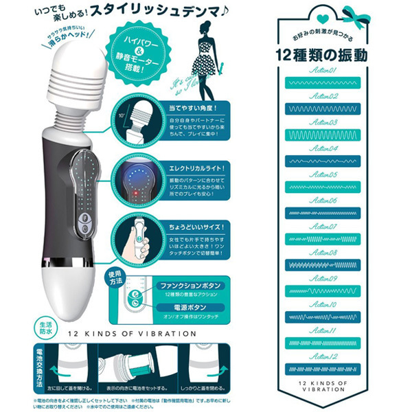 女性に嬉しい思いやり満載♪ポップにプレイを楽しめるコンパクト電マ。●黒×白のスタイリッシュなカラー●全長20cmほどの使いやすいサイズ●ヘッド部分は当てやすく10度傾斜●電源ON/OFFともにワンタッチ操作●Fボタンで12種類パターン切り替え●振動と連動する鮮やかライト機能●メンテナンスしやすい生活防水。1人でもラクラク操作できるカーブヘッド×操作しやすい小さめサイズ×暗い所でも使えるイルミネーション機能!満足必至な機能をたっぷり詰め込んだ優秀電マ。マッサージャーデビューにはもちろん、アレコレこだわる欲張りレディにオススメです。 |