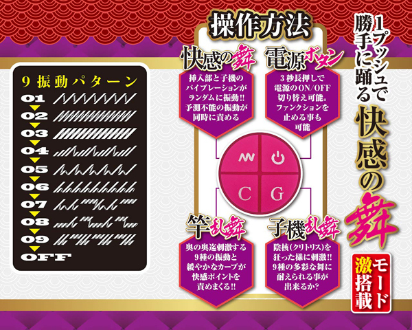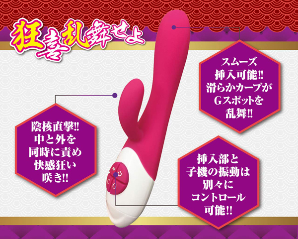 快感が乱れ舞う…快感絶頂バイブ!挿入部の先端と子機にローターを搭載しGスポットとクリトリスを同時責め。9段階の振動パターンが刺激に彩りを与えます。また予測不能な振動が楽しめる快感の舞モードを搭載し、さらに楽しくご使用いただけます。なめらかシリコン製で挿入もとってもスムーズで潮吹き調教やGスポット開発にも便利!