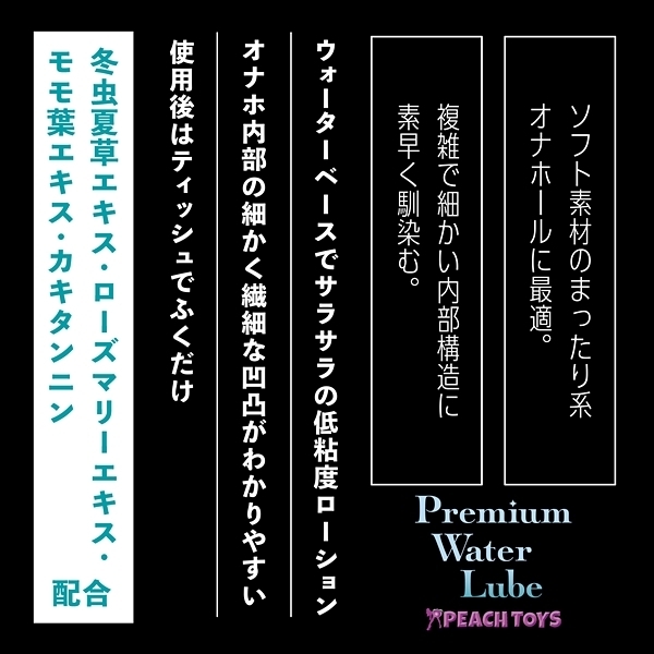 『水のように滑らか、でもヌルヌル感持続!ふき取るだけでOK!』「ふくだけローションPremium Water Lube (180ml)」が、ラベルデザインと容量・成分をリニューアルして再登場です!黒いポンプの「ふくだけPWL」は、【低粘度+シャバシャバ系】ソフト素材のまったり系オナホールに最適。複雑で細かい内部構造に素早く馴染む。冬虫夏草エキス・ローズマリーエキス・モモ葉エキス・カキタンニン配合●ウォーターベースでサラサラの超低粘度ローション●オナホ内部の細かく繊細な凹凸がわかりやすい●使用後はティッシュでふくだけ簡単●無香料●安心の日本製●200ml スタンダード <成分>水、プロパンジオール、ヒドロキシエチルセルロース、乳酸、キサンタンガム、ローヤルゼリーエキス、アルギニン、マカエキス、水溶性コラーゲン、グリチルリチン酸2K、ローズマリーエキス、モモ葉エキス、カキタンニン、銀、フユムシナツクサタケエキス、クエン酸、クエン酸Na、BG、エタノール、セルロースガム、炭酸水素Na、フェノキシエタノール、EDTA-2Na、ブチルカルバミン酸ヨウ化プロピニル |