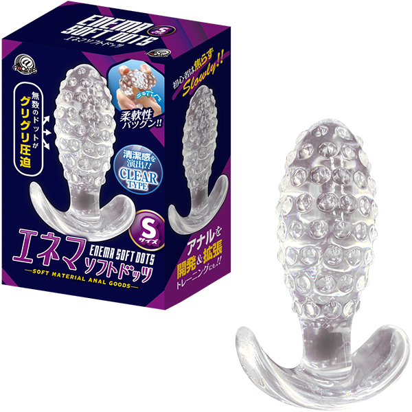 表面には無数のドットイボが配置されたアナルも悦ぶ「エネマソフトドッツS」です♪挿入部分の無数のドットがアナルにフィット!アナルの開発&拡張に最適なプラグで挿れやすくて抜けにくい設計♪これさえあればアナルプレイが存分に楽しめる!ソフトエラストマー製だから柔軟性も抜群で、丸洗いもできて何度も使用OK♪使いやすいストッパー付きで安心してプレイできます!見た目も美しいクリアタイプのアナルプラグで初心者向き♪まずはこれから挿れてみよう!