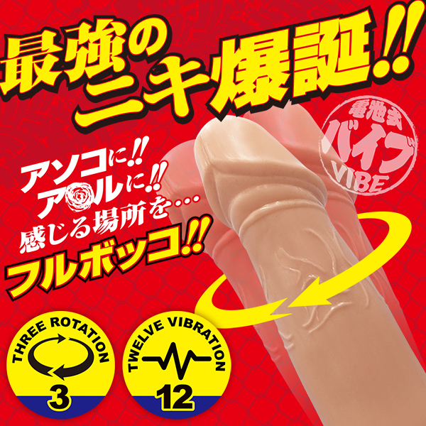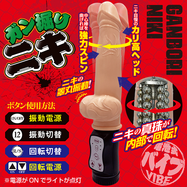 荒ぶるニキのペニスで掘られる快感を堪能せよ!アソコにもアナルにも使えるカリ高ヘッドが特徴のバイブ「ガン掘りニキ」♪感じる場所をフルボッコする最強のニキが遂に爆誕!挿入せずにはいられないリアルな漢のイチモツ風のデザインが何とも凛々しいカリ高バイブ♪竿の回転と睾丸部分の激振動でナカもソトも刺激してイカせてくれる!カリの張り出しが効いたヘッドは3段階のスイング機能を搭載♪タマ部分に内蔵したモーターは12種類のパターンを搭載し、パールの回転と合わせて充実した刺激を味わわせてくれます!電源は単4電池3本となっています。 |