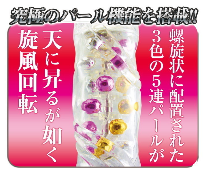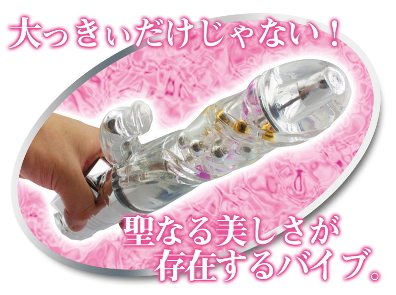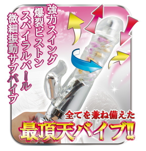 振動、回転、ピストン機能まで全てを持ちあわせた最強のパール入りバイブが登場。螺旋状に配置された内蔵パールは、まさに天に昇っていくかのよう!独特フォルムの流線型クリバイブが、細かな振動で優しく刺激してくれます。さらに、膣内をかきまわす強力スイングはリバース機能も備えています。美しいクリアボディに秘められた神秘の快感を思う存分お楽しみ下さい。