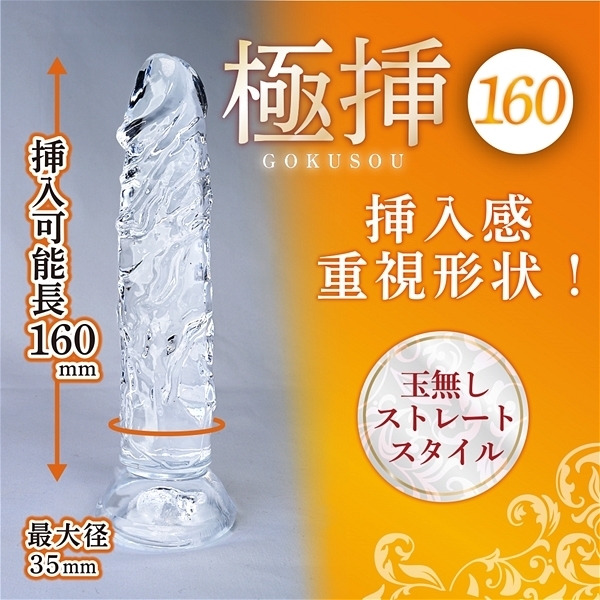 大満足の挿入長160mmクリアディルド。程よい質感とスタイリッシュなクリア素材、タマ無しストレート形状で挿入可能長をMAXまで実現!吸盤で床や壁に固定して、セルフでもパートナーとも楽しめる高品質ディルドです。
