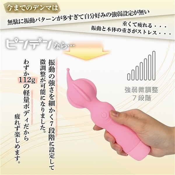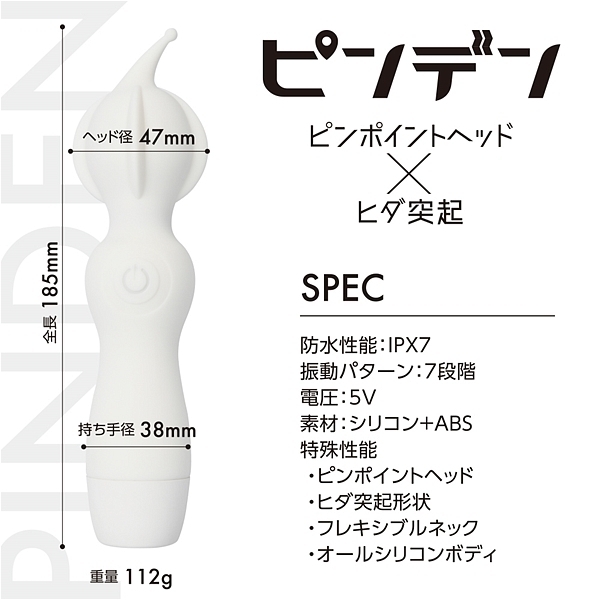 ピンポイントヘッド・ヒダ突起付の完全防水シリコンデンマです。上質振動の強力モーター搭載・高品質シリコンボディ・フレキシブルネックの上級性能に加えてピンポイントを強力刺激出来る先端突起と割れ目に入れて楽しめるヒダ突起形状をプラスしました。振動も一般的なパターン振動では無く、こだわりの強弱微調整可能な7段階振動です。もちろん普通のデンマスタイルも可能なので色々な楽しみ方が出来ます。しかもIPX7の完全防水性能だから使い勝手もバツグンです。90分満充電で60分使用可能(使用環境により大幅に増減します)なリチウムイオン電池内蔵。パワフルなのに繊細な使い方も楽しめるデンマです。●カラー:ホワイト |