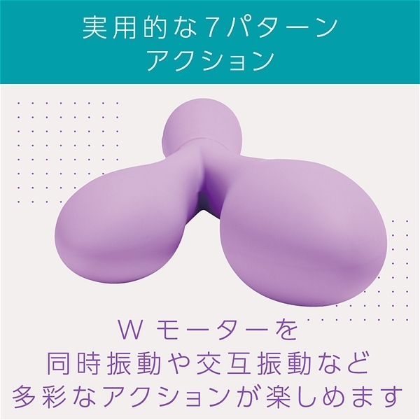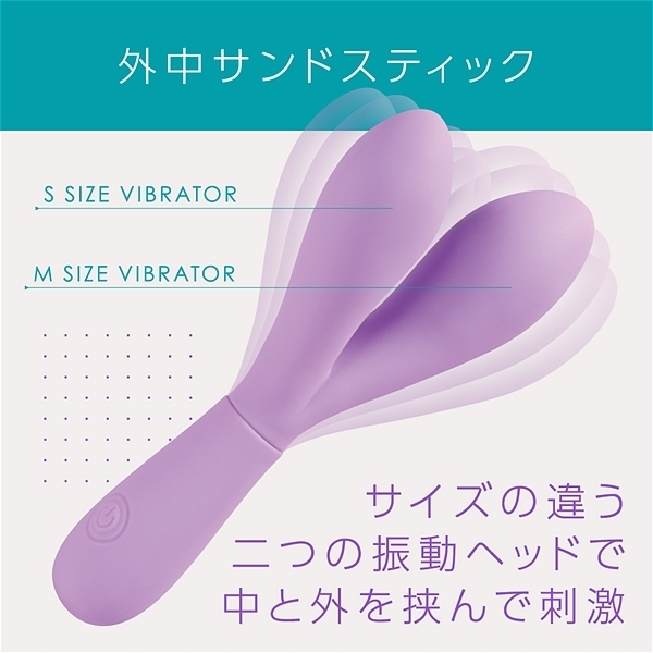 大小、サイズの異なる二つの挿入部が配置されたスティックバイブです。高品質なシリコン素材に上質な振動を演出する高性能モーターをそれぞれに搭載して、挟んだり、自分に合ったサイズを挿入してお楽しみ頂けます。IPX5の防水性能だからしっかり洗えて衛生的に何度も使用可能です。3.7Vリチウムイオンバッテリー搭載で90分で満充電、最大45分の連続使用が可能です(使用環境により大幅に増減します)。多彩で実用的な7パターン振動アクション。色んな楽しみ方が出来る高性能プレジャーグッズです。●カラー:パープル