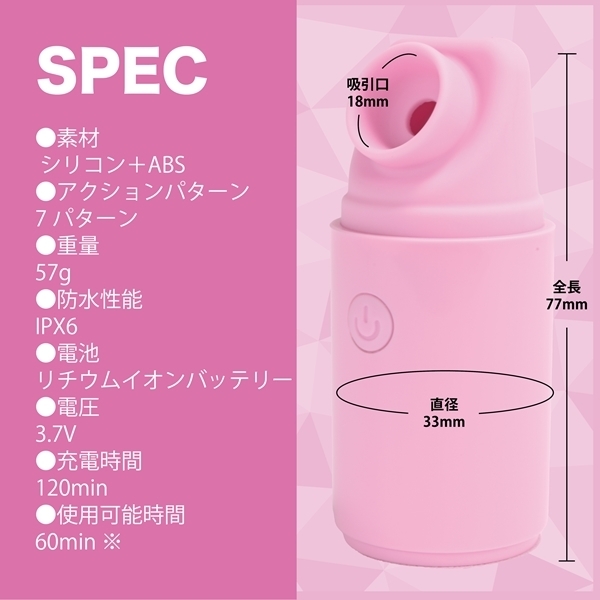 スタイリッシュな見た目で蓋付きだから持ち歩きにも便利な吸引ローター。上質なモーター搭載の吸引機構に高品質シリコン素材の吸引口と持ちやすいサイズ、さらにはIPX6の高レベル防水性能だからしっかり洗えて衛生的です。使用時は蓋を外して底面に付けられます。どこでもキャリー出来る自分だけのプレジャーアイテムです。3.7Vリチウムイオンバッテリー搭載で120分で満充電、最大60分の連続使用が可能です(使用環境により大幅に増減します)。多彩で実用的な7パターンの吸引を演出します。見た目と実用性を兼ね備えたMY PLEASURE GOODSです。●カラー:グリーン |