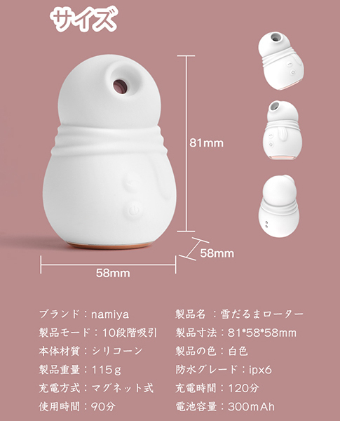 【愛の雪だるま】この冬を最も暖かくできるゆきちゃん、恋人や親友に送ってみませんか?癒されるキュートな見た目を裏切る10種類のズンズン吸引に悶絶しちゃおう。滑らかで素肌のようにスベスベとした、マシュマロやおモチのような触り心地♪初心者にとっても最高のイク調教神器に間違いなし!!【音速でクリ責め+乳首責め】敏感部分に直接触れることなく、超パワフルな振動と吸引が味わえる世界初の吸引バイブ!音波式モーターの高刺激周波数で、クリトリスをピンポイント攻撃。ボボボボっ!と力強い振動波によってブルブル揺さぶられ、まるでクリトリスをマッサージされているかのような未知の快感を得ることができます!!【安全素材+充電式】直接肌に触れるものだから、さらさらすべすべの高品質シリコン使用しています。そして、手にフィットする握りやすい形状と充電式リチウム電池を採用した軽量構造で疲れを感じることなくプレイに集中できる魅惑のアイテムが登場!【静音仕様+コンパクト】生活防水仕様となっているので、お風呂やプールなどの水場で楽しんだり、使った後は水洗いしてお手入れすることができます!また次も安心して楽しむことができるのも魅力です!●生活防水(IPX4)●10段階吸引●医療用シリコン素材、ABS●USBマグネット充電●充電時間:120分、稼働時間:90分●電池容量:300mah※こちらの商品は受注発注商品の為、ご注文から発送までに3、4営業日掛かる場合が御座います。 |