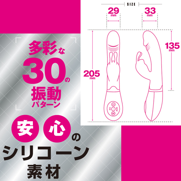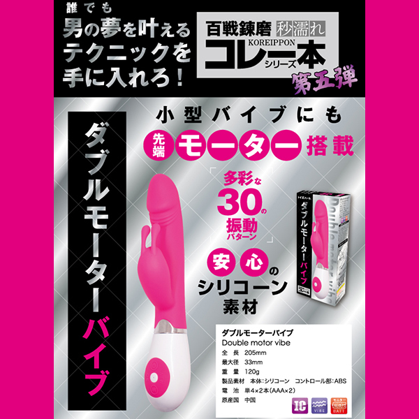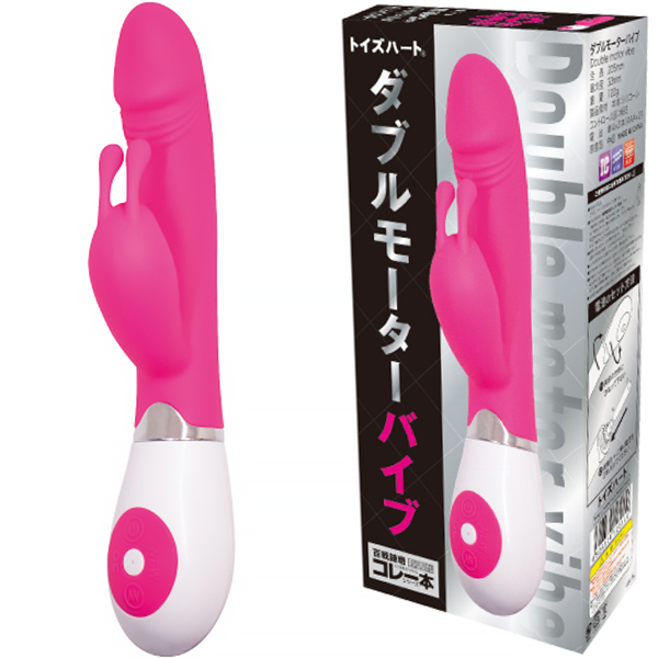 小型バイブにも先端モーターを搭載!クリトリスもしっかり刺激するダブルモーターを搭載した「ダブルモーターバイブ」。大きすぎず小さすぎずなちょうど良いサイズ感で2点責めの王道タイプ!単四電池2本で駆動するバイブで30種類もの豊富なパターンで飽きずに振動刺激を体感できます♪挿入シャフトは先端が亀頭のような形状で素材にはシリコンを採用!挿入フィーリングも悪くなく、モーター内蔵の子機はウサ耳タイプとなっておりますのでクリへの刺激もダイレクトに楽しめます♪
