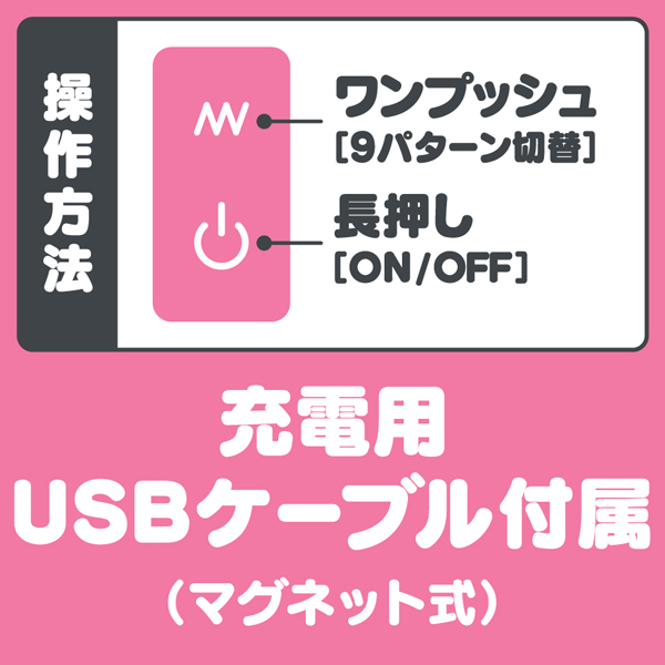 ピンクのシンプルで可愛いUSB充電式ミニ電マ。全長13.4cm、重さ約90gと軽い携帯に便利なコンパクトサイズ!ヘッド部分には高品質なソフトシリコンを内蔵しているため強く当てても痛くなく、9種類の豊富な振動アクションをしっかりお楽しみいただけます。また、IPX7等級の完全防水製で使用後の丸洗いも可能!ワンプッシュ操作で初めてでも簡単に扱える高性能な電マです。