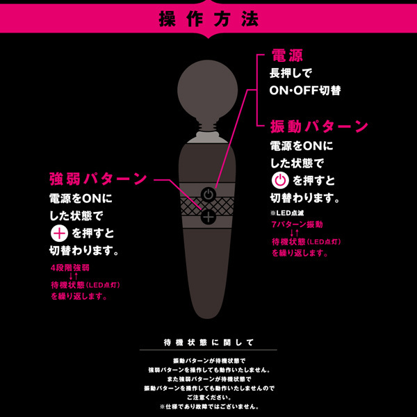 USB充電式でコードを気にせずプレイできるデンマ!ヘッド径が6.5cmで当たる面積が大きく、パワフルな振動やパターンを存分に楽しる!振動パターン7種類×強弱パターン4段階で全28バリエーションからお好みの刺激が見つかります♪グリップ振動が低減されており、持ち手が痺れないので長時間使用もノンストレス!ヘッドは最大70度まで曲がり、思うまま操作出来ます!防水機能で潮吹きも水洗いも心配なし。