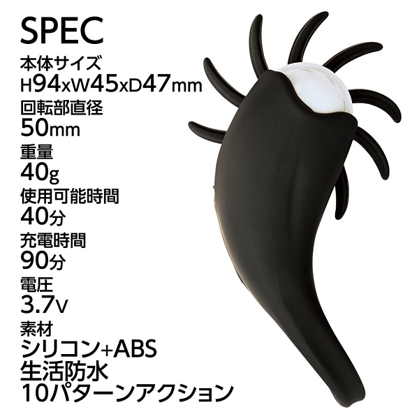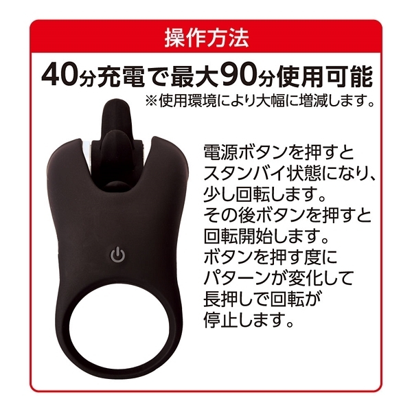 左右逆回転を繰り返す特殊ローリングアクション機能のリング登場。よりリアルな低速回転アクションをハイパワーモーターで実現。指にはめたり、リングとして着用してク○や乳首を刺激!リバース回転を繰り返す動きを含む10パターンアクション。リチウムイオン電池搭載で90分で満充電・最大40分使用可能(使用環境により大幅に増減します)。生活防水性能。リング部は肌触りの良いシリコン素材採用●カラー:ブラック