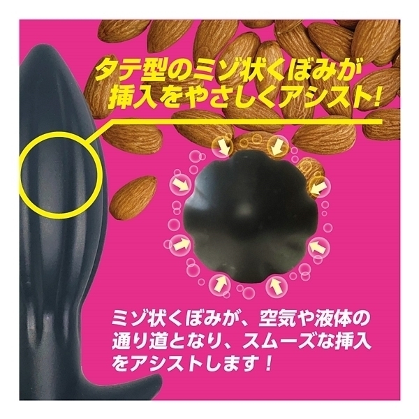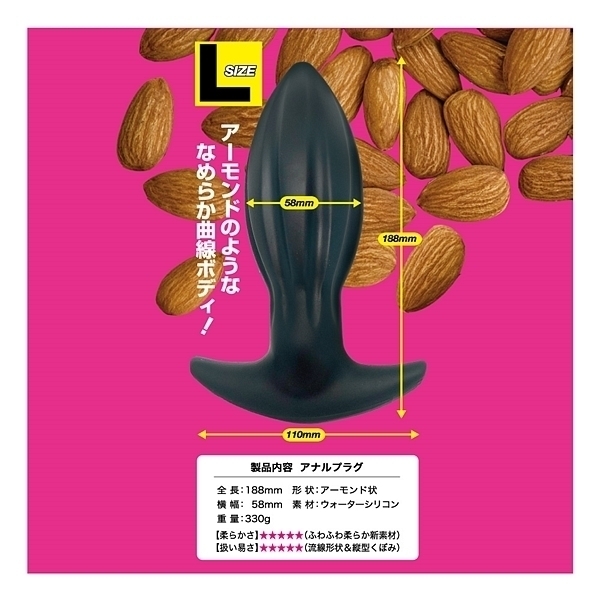 アーモンドフォルム×ウォーターシリコン!形状と素材にこだわった、新感覚ア●ルプラグが新登場!アーモンドナッツのような形状は、先端部に向かってすぼんでいく流線フォルムとなり、スルッとした挿入感を生み出します。さらに、中央部に配置された縦縞状のくぼみが、空気や液体の通り道となり、挿入心地をサポート。最下部は返しの付いた錨モデルで、ヒップラインに沿ったデザインが違和感を低減させます。本体素材には、最先端のウォーターシリコン素材を使用しました。水のように柔らかい、と大評判の人気素材です。すべすべな滑らかさ、もっちりとした肉感弾力、ゴムのように伸びる高伸縮性。あなたにピッタリ寄り添う恍惚素材とスムーズなインサートとなる快感型状で、新しいア●ルプラグです。「L」は太さ58ミリのエキスパートモデル。 |