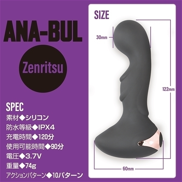滑らかで心地よい肌触りのシリコンボディと上質なブルブル振動が織りなす気持ちの良い刺激が特徴のアナグッズです。ゼンリツ刺激に特化した特殊形状に高品質モーター振動が10パターン楽しめます。充電時間120分で最大90分使用可能(使用環境により大幅に増減します)IPX4の防水性能だからサッと水で洗えるので衛生的です。