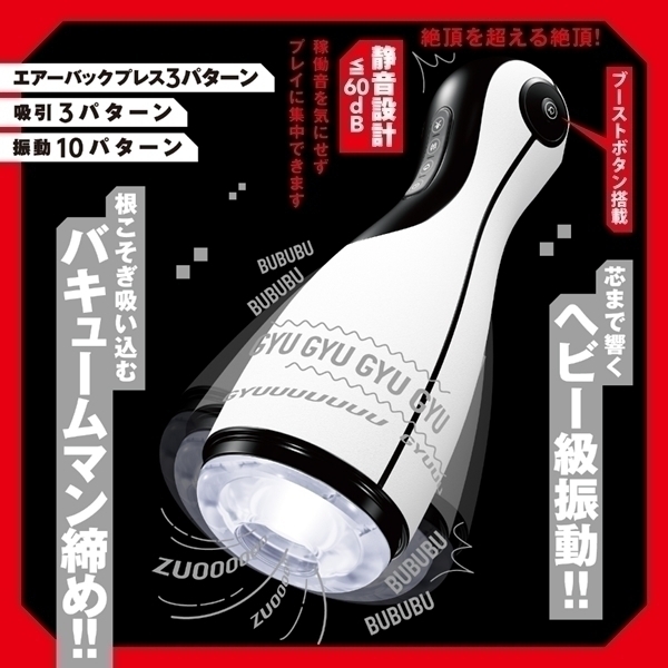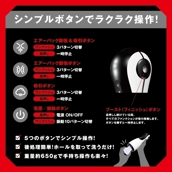 リアルな使用感を追求した電動オナホールです♪両サイドのエアーバックが膨らむことで心地よいフィット感を実現し、安定した使用をサポートします!吸引パターンや振動パターンが複数用意されており、好みに応じてカスタマイズ可能♪高品質エラストマー素材を使用し、安全性と使用感を重視しています!静音設計(≦60dB)により、稼働音を気にせず集中してリラックスタイムを楽しめます♪ブーストボタンが搭載されており、必要に応じて設定を調整できるのも魅力です!エアーバックプレスや振動の多様なパターンで、快適なひとときをサポートします♪ |